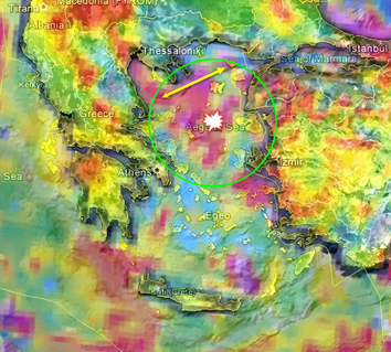 Στη περίπτωση αυτή, αναμένονται σεισμοί και σε άλλα νησιά του Ανατολικού Αιγαίου, στη Ρόδο, στην Εύβοια και την Κρήτη υποθέτοντας ότι οι ασκήσεις έγιναν στα κέντρα του πράσινου και του κίτρινου κύκλου.